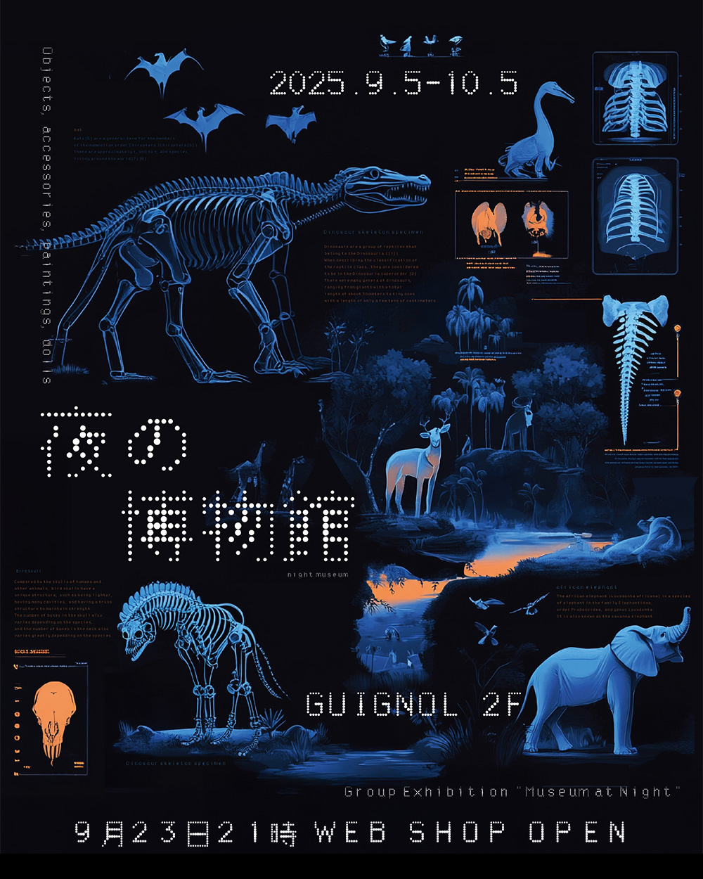 ![]() *************** 「夜の博物館」 2025年9月5日(金)〜10月5日 (日) 博物系雑貨イベント「夜の博物館展」を大阪中崎町ギニョール2階にて開催します。 生物、昆虫、鉱物、人体、標本まで幅広いテーマの作品が並ぶ展覧会です。 博物をモチーフにしたオブジェ、人形、絵画、アクセサリーなどさまざまなジャンルの作品を販売します。 今回で9回目の開催。ギニョールの2階を夜の博物館の部屋にみたてて開催いたします。 9月23日21時から、WEB SHOPでも販売します。 *************** <2024年に開催した「夜の博物館」ギニョール2階での展示風景> ![]() <2024年に開催した「夜の博物館」ギニョール2階での展示の動画>