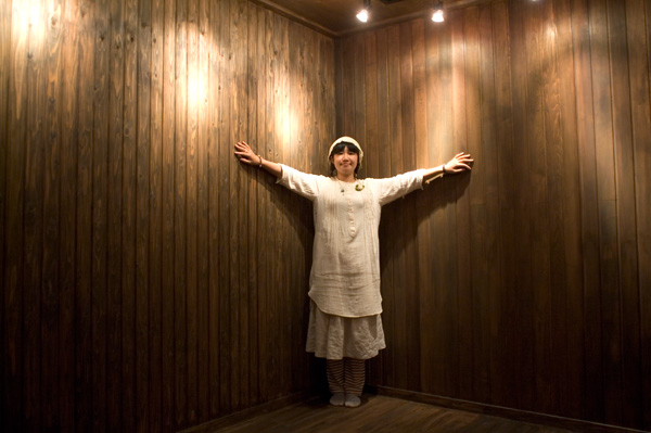 2階のスペース・・床・壁とも温かみのある茶色の木を使用。(写真は「at home」展の展示風景。)